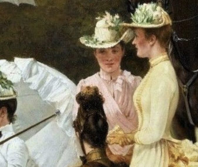 Die Hüte, zu Beginn noch klein, später immer größer werdend, setzten das Gesicht mit ihren Krempen in Szene und boten Platz für viele neckische Federn oder Schleifen – auf den Bildern der Maler Tissot oder Edgar Degas sieht man junge Frauen oft ein reichlich verrücktes Potpourri auf dem Kopf spazieren führen.