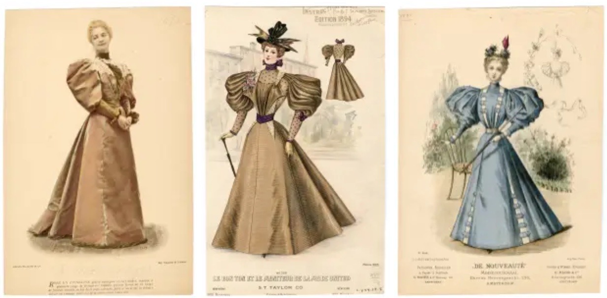 Die folgenden zwei Jahrzehnte brachten noch engere Taillen, betonte Hüften und schmale Vorderpartien. Die Silhouette wurde detaillierter: Puffärmel, Rüschen, je nach Saison unterschiedlich ausgestellte Schultern. Überhaupt: Die Ärmel! Sie wurden kurzzeitig so voluminös, dass man sie leg-of-mutton-Ärmel nannte, das heißt Keulenärmel oder noch wörtlicher übersetzt „Hammelkeule“-Ärmel. 🙂