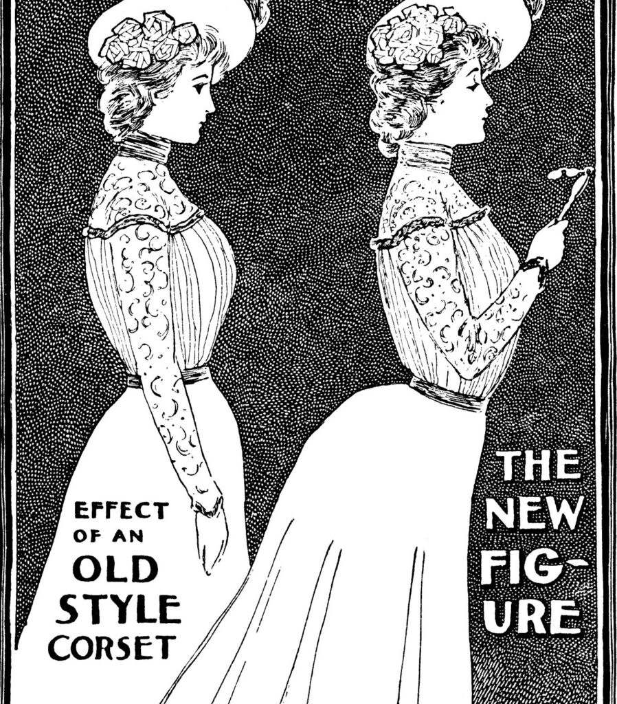 Dieses Bild aus dem Ladies‘ Journal um 1900 zeigt ganz gut, worum es bei dem neuen „Sans Ventre“-Korsett ging… bildrechte: public domain